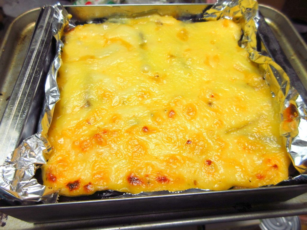 ⑤最後に、チーズソースを流し、チーズをかけて、オーブンでこんがりするまで焼きます。