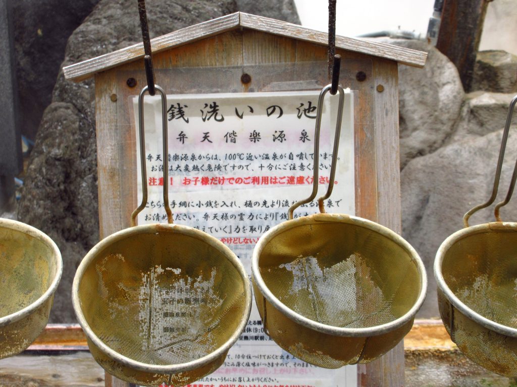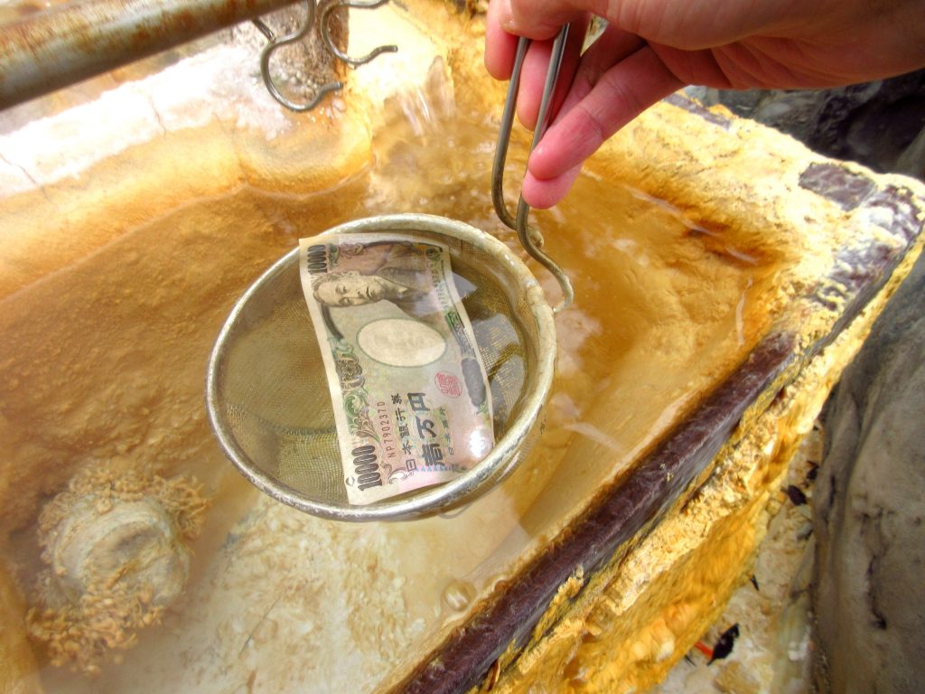 湯気が立ちのぼる宝池で小銭を洗うと、