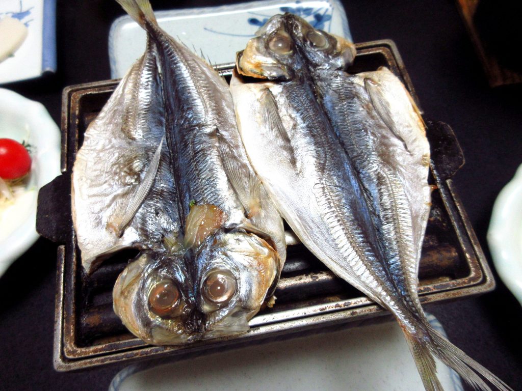 地域特産のあじの干物を、目の前でパチパチと炙ったり、