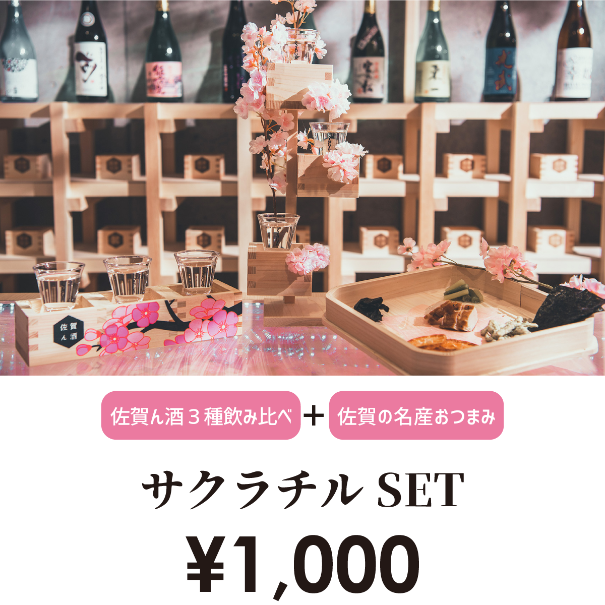 佐賀ん酒三種飲み比べと佐賀の名産おつまみがセットになった、サクラチルSETは1,000円。