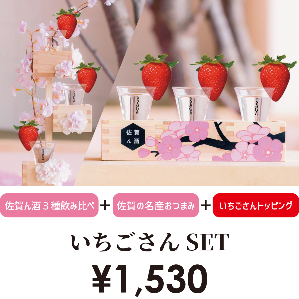 佐賀ん酒三種飲み比べと佐賀の名産おつまみ、またいちごさん3個がセットになった、いちごさんSETは1,530円で楽しめます♪