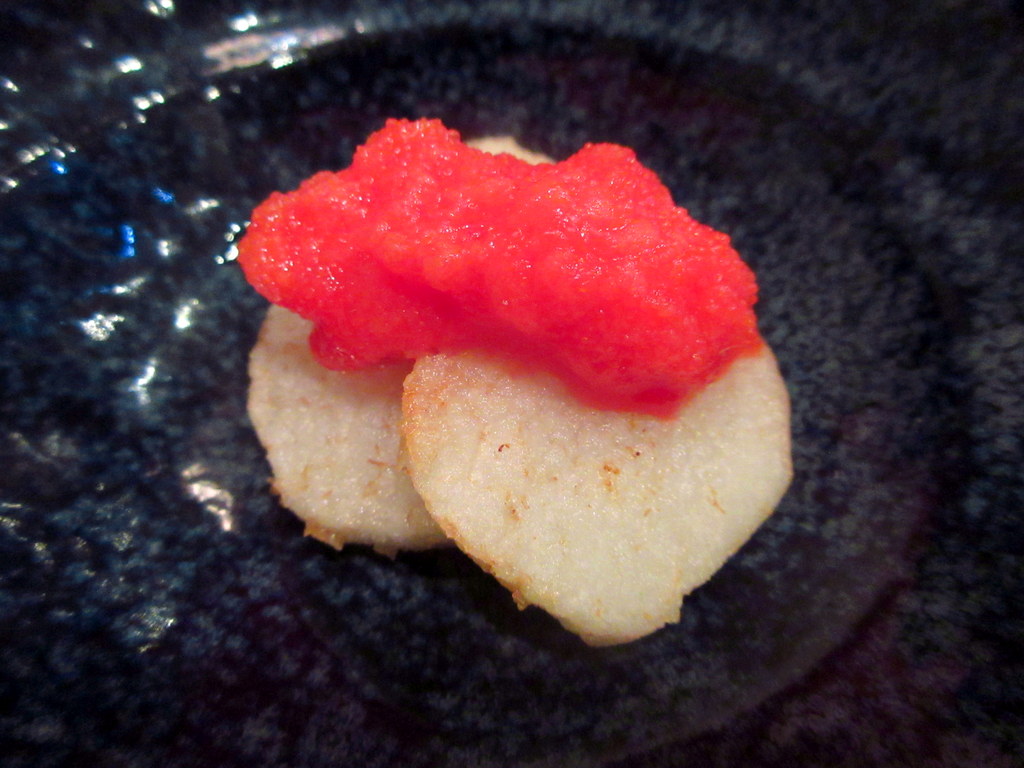 お通しは長芋を揚げて、上に明太子のようなソースがかかったもの