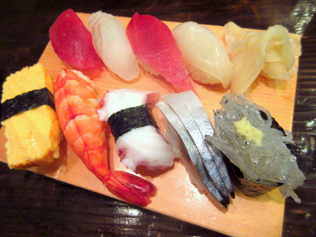 マグロが2貫・タイ・イカ・玉子・蒸しエビ・タコ・