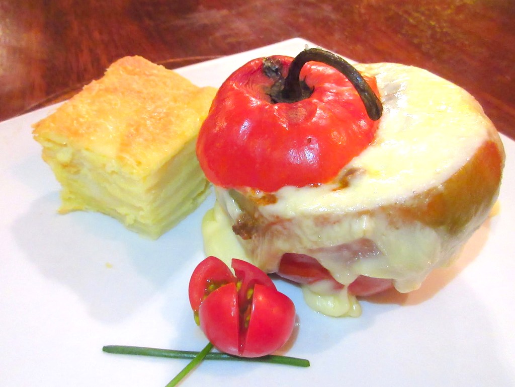 手作り感のあるミートソースと、とろけるチーズがパプリカの中に詰められていて、