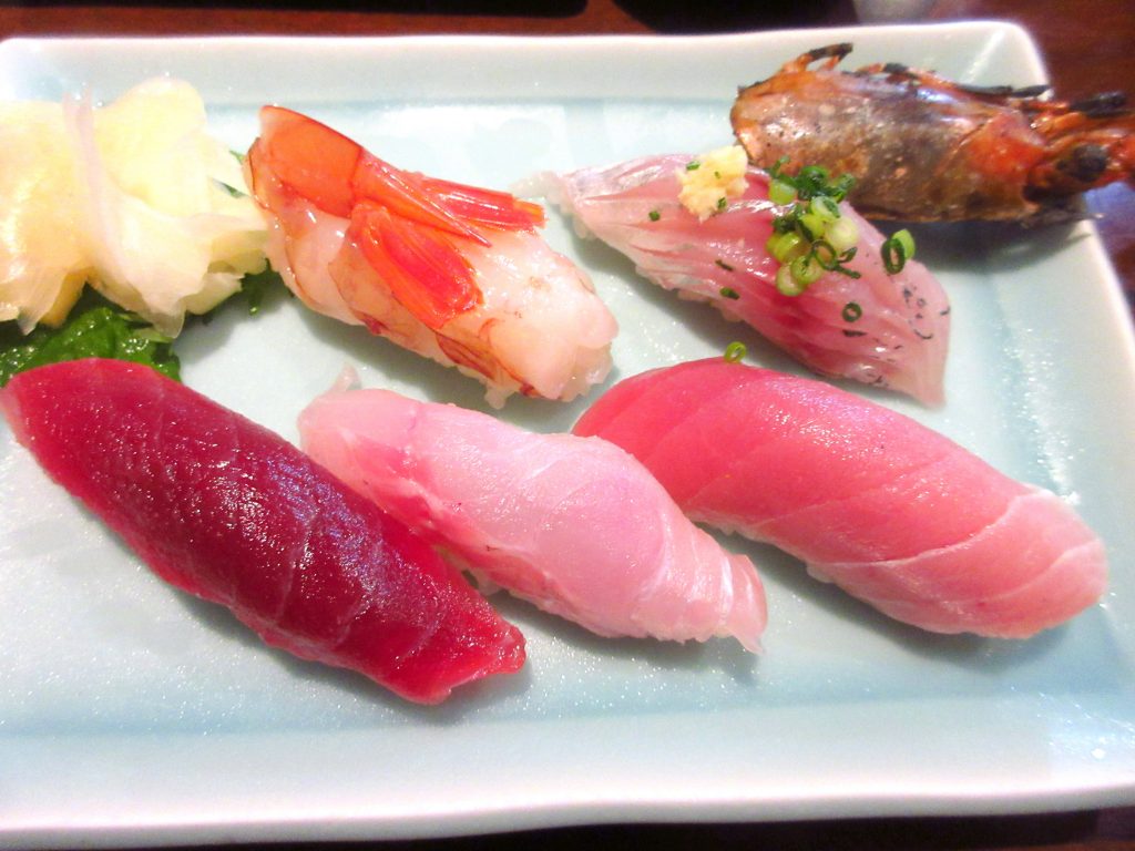 赤貝、赤身、タコ、中トロ、アジなどの7点盛り合わせ。