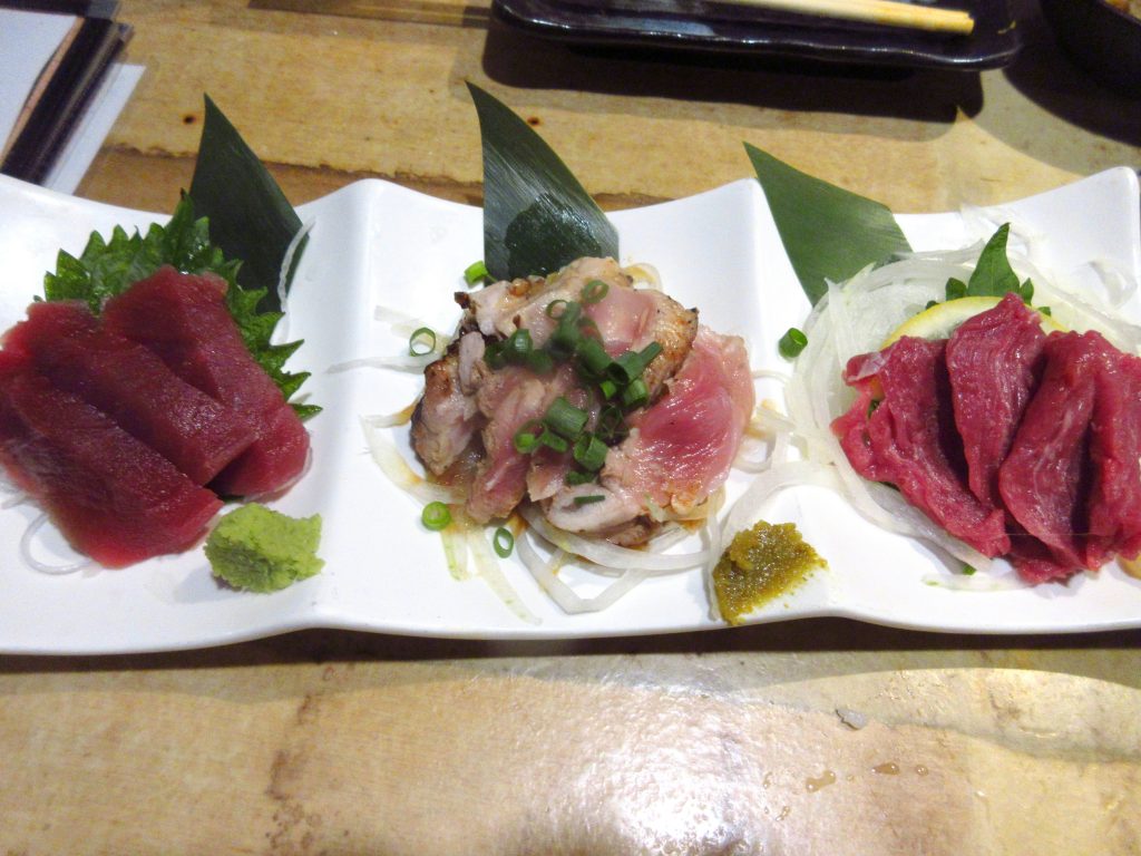 叶え家コンセプトであるお薦め食材の3点を盛り合わせにしました。馬刺しの赤身、本マグロの赤身、鶏の炙り刺しの3点をリーズナブルな価格で皆様にご提供します。