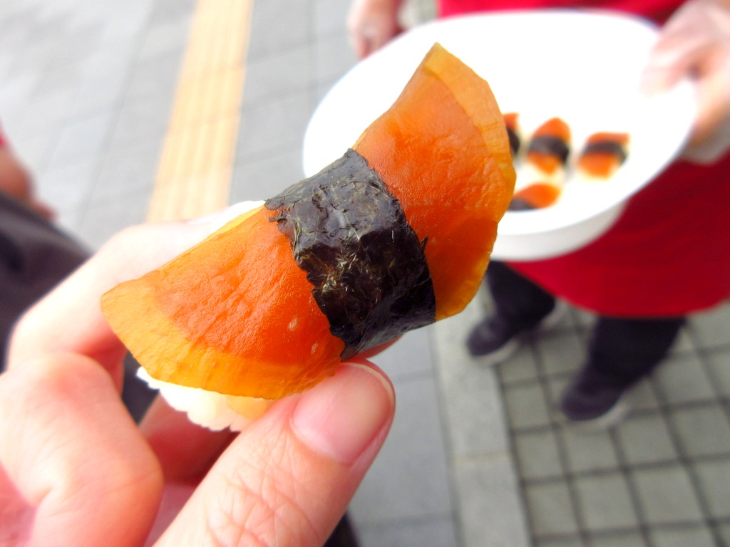 このようにちっちゃなおにぎりにお漬物をのせ、海苔で巻いて