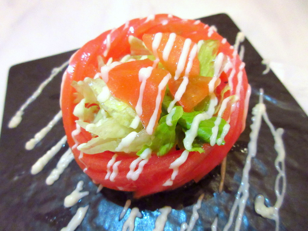薄くスライスされたトマトが、きれいに飾られていて、見た目にも可愛い一品。