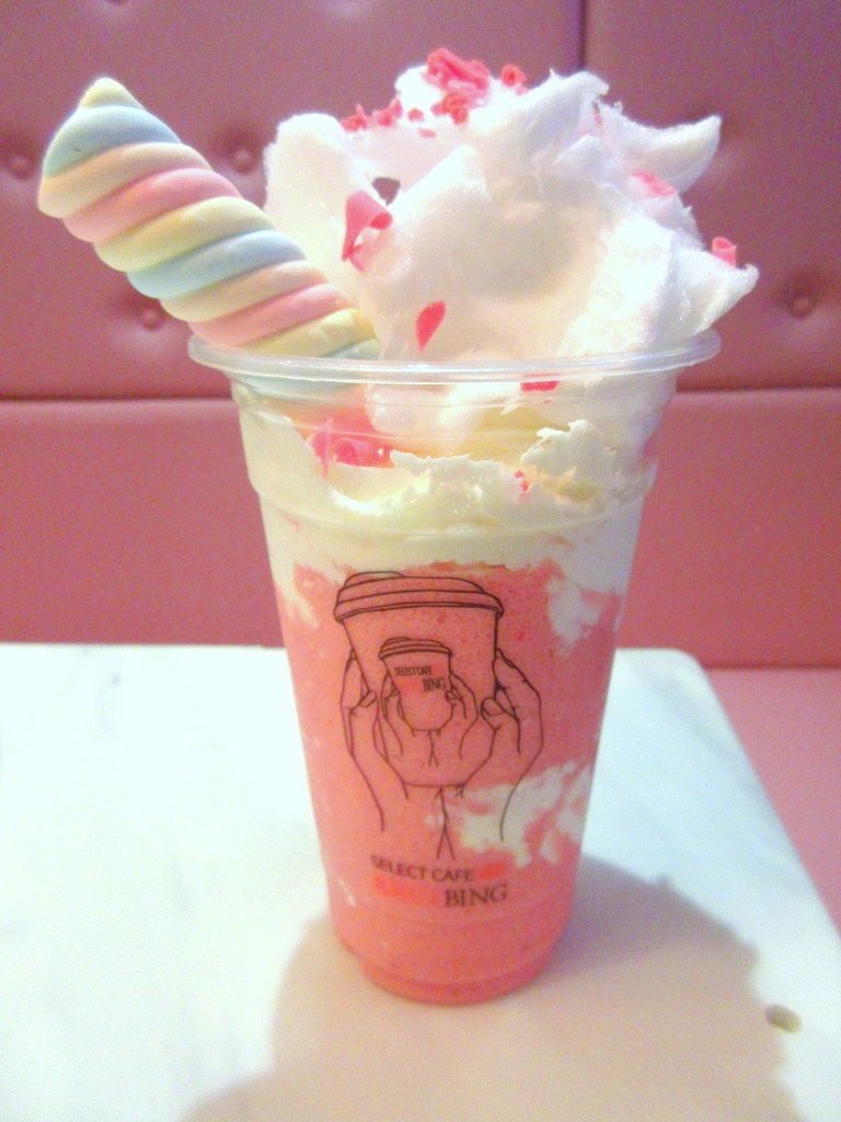 綿菓子の乗ったとても可愛いストロベリーシェイク