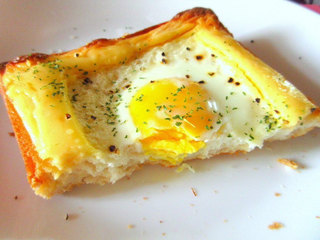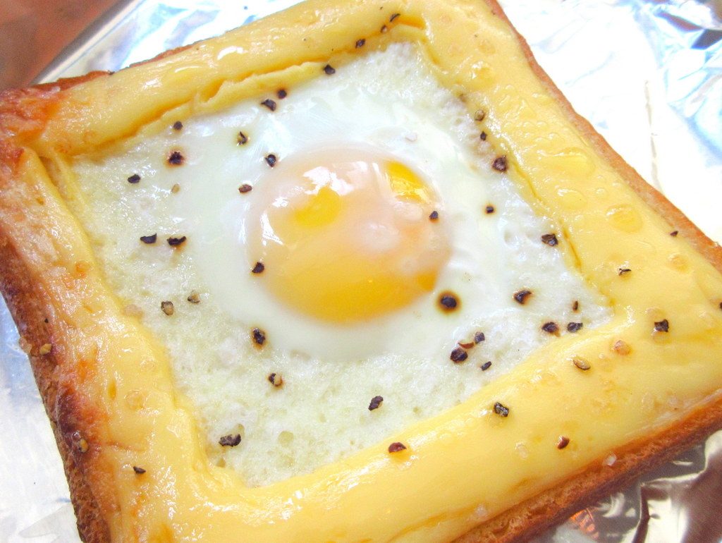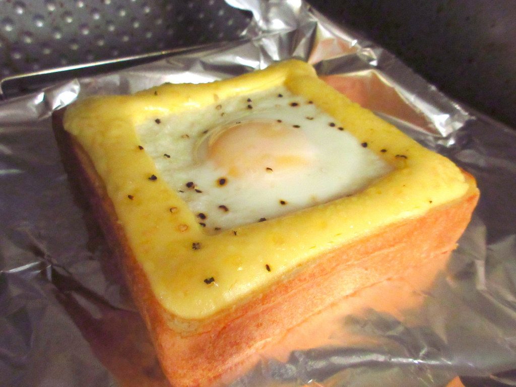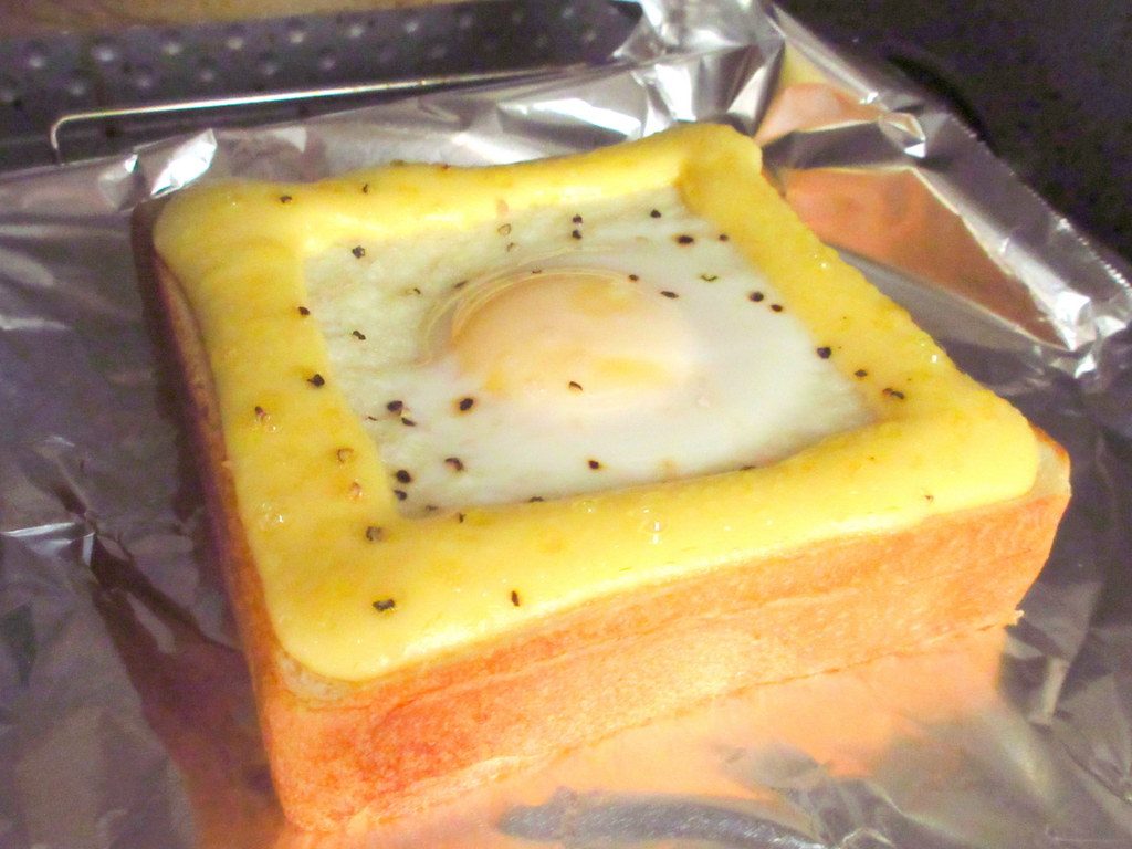 普通の作り方は、トーストに卵を割って焼く方法ですが、これでは卵が流れて結構大変(;´・ω・)