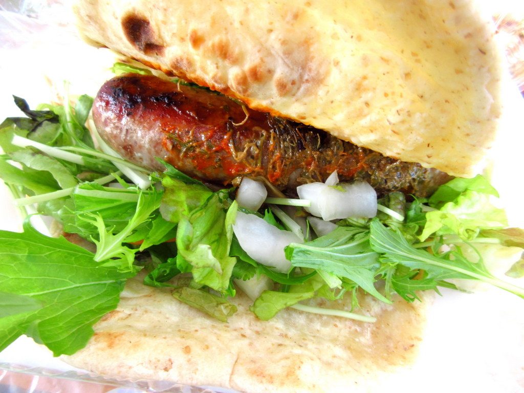 小麦のトルティージャにスパイスの効いたソーセージ、レタスなどの野菜に、