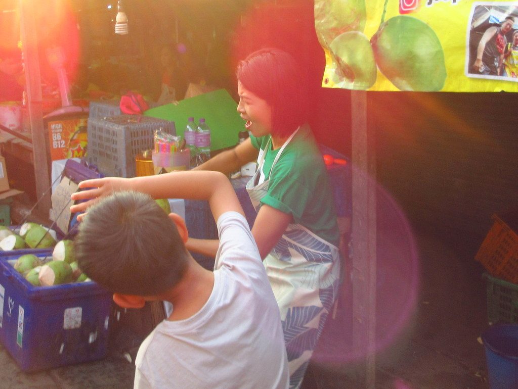 テンポよく包丁で力いっぱい叩き割り、ココナッツジュースを提供していました!