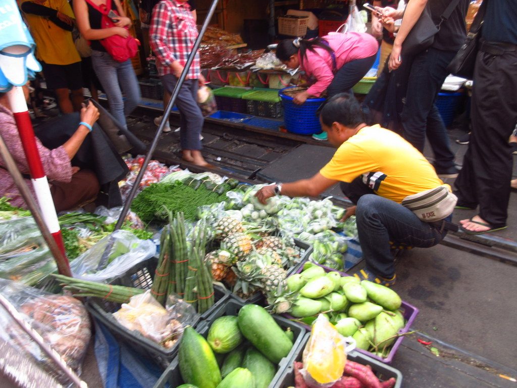 なぜ危険かというと列車が通る寸前まで線路の上では様々な食材が販売されているのです。
