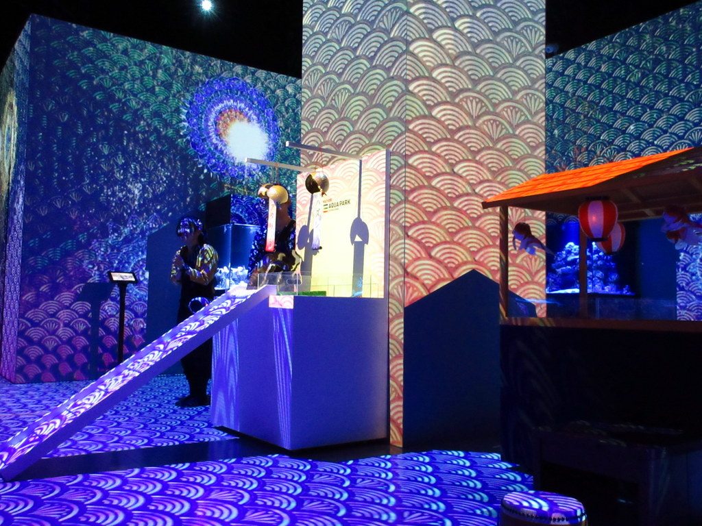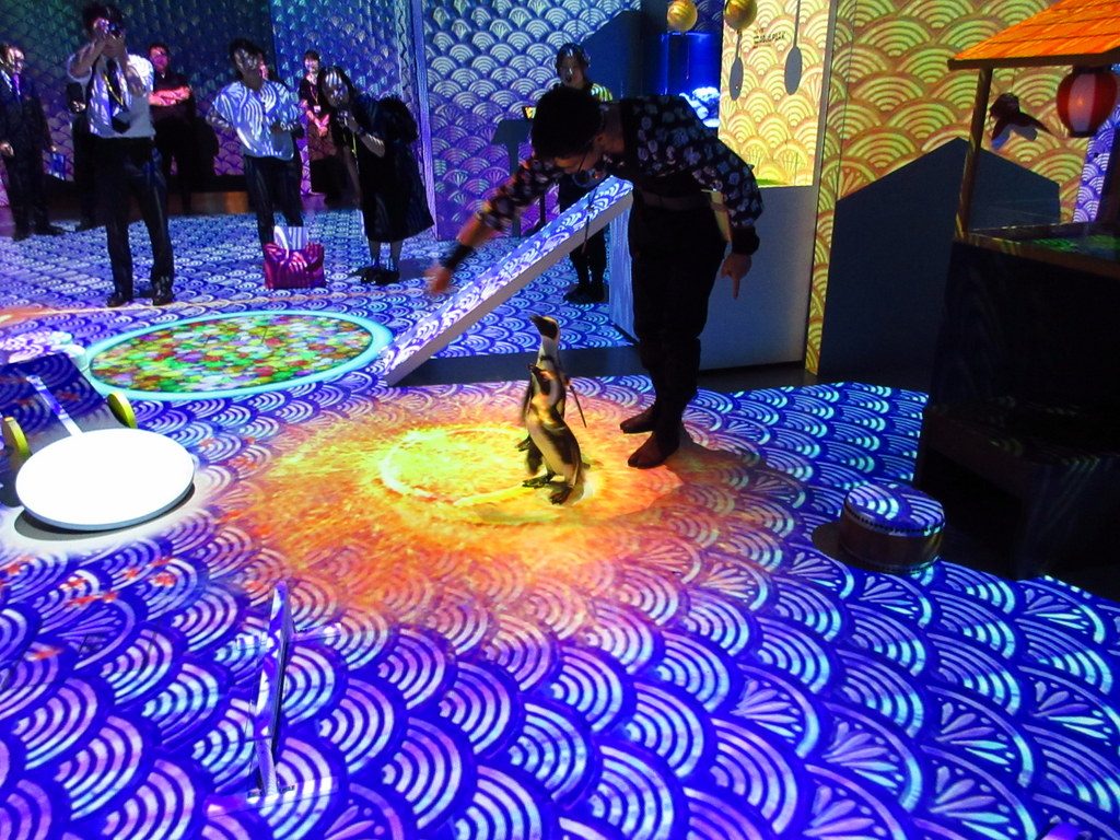 プロジェクションマッピングと連動していて、ペンギンさんが金魚すくいをしたり、