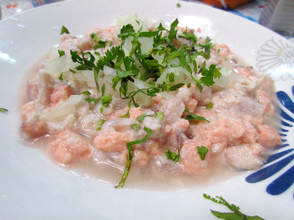 サーモンと白身魚のセビーチェはペルーのものよりもカットが細かく、