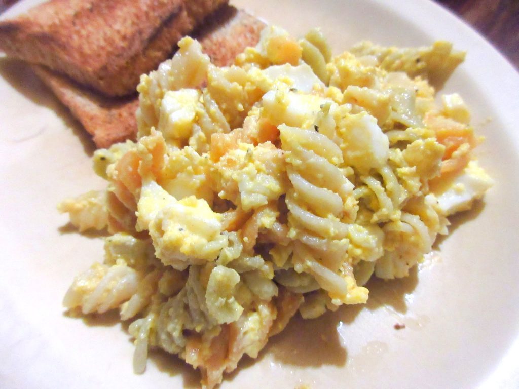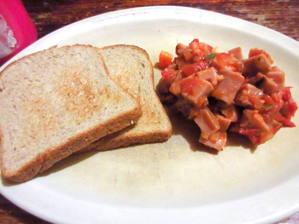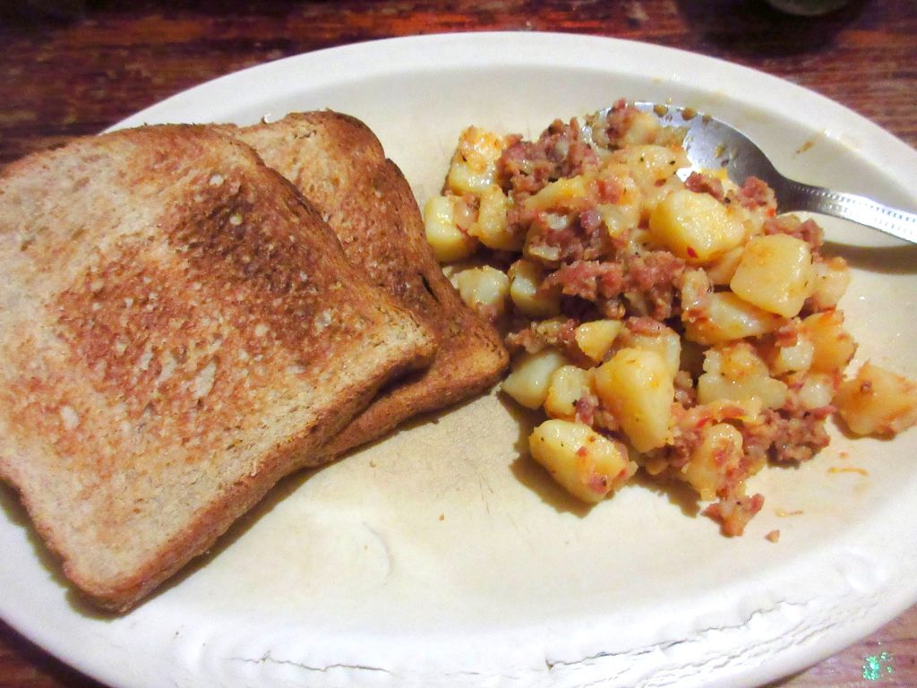 朝は、朝食がついていて、トーストとおかず、ドリンクなどがあります。