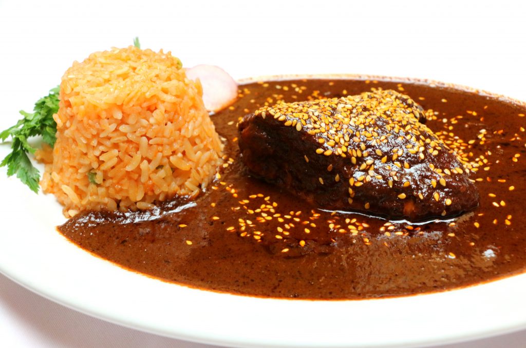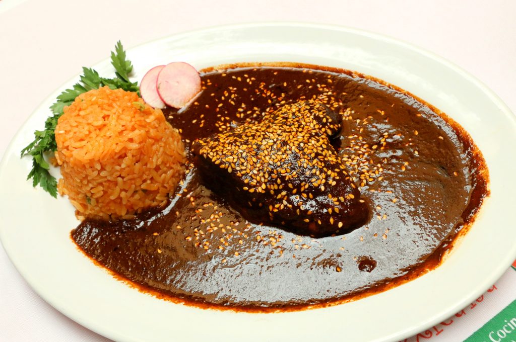 正式には、モーレ・ポブラーノ(mole poblano、プエブラのモーレ)と呼ばれるもの。唐辛子とチョコレートをベースに、トマト、アーモンド、ピーナッツ、胡桃、ゴマ、干しぶどう、パン、トルティージャ、玉葱、ニンニク、胡椒、シナモン、砂糖、ラード、月桂樹の葉、シナモン、クミンや塩を材料とする、重複雑なソースです。 日本でも食べられるところがあるとは・・・!