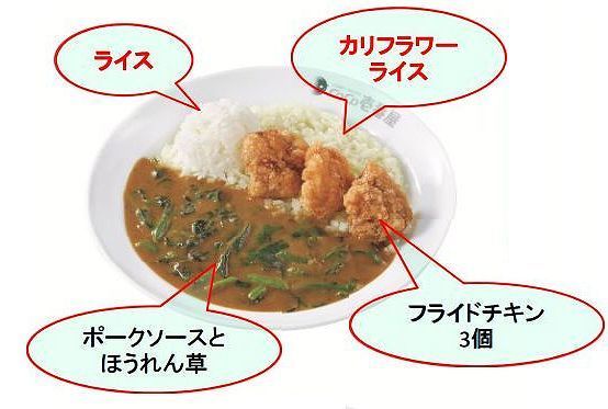 全国の店舗でご飯の量を 30gまで減らし、代わりにカリフラワー ライス 120gを