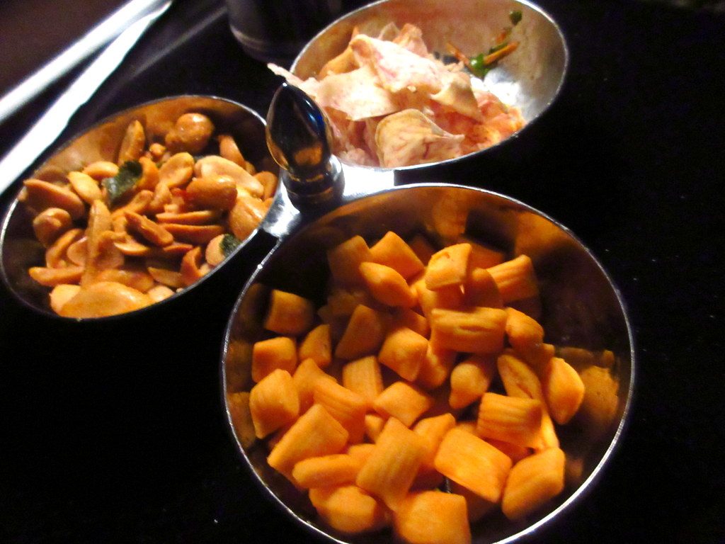 卓上にはタイ風のスパイシーなナッツやスナックなどの