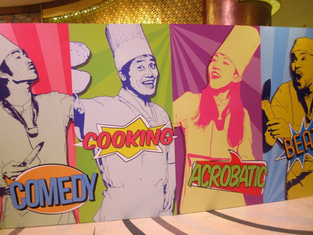 シェフの四人が野菜を切ったり、炒めたり、ふざけたり、