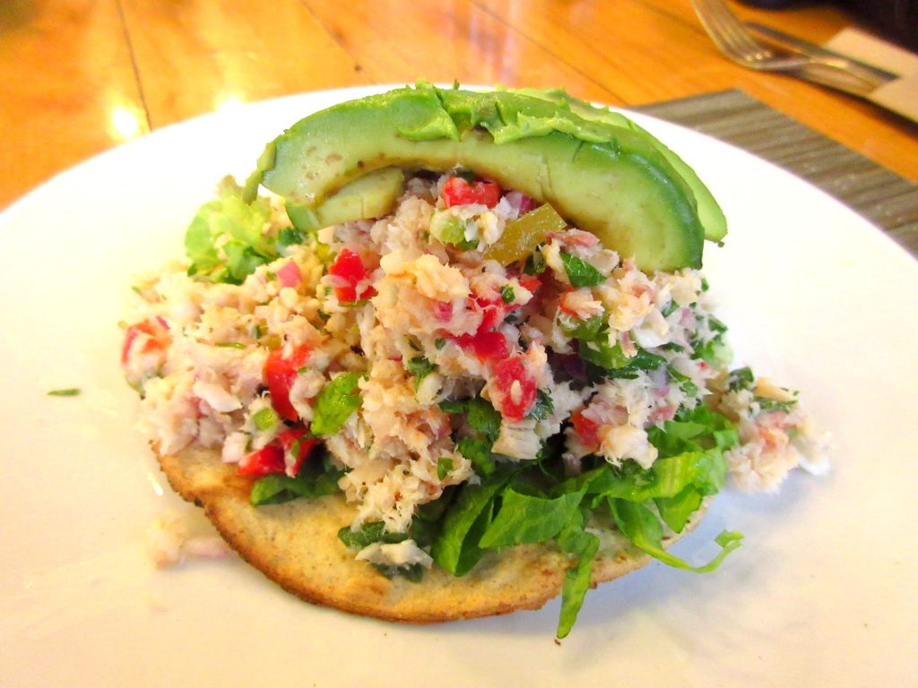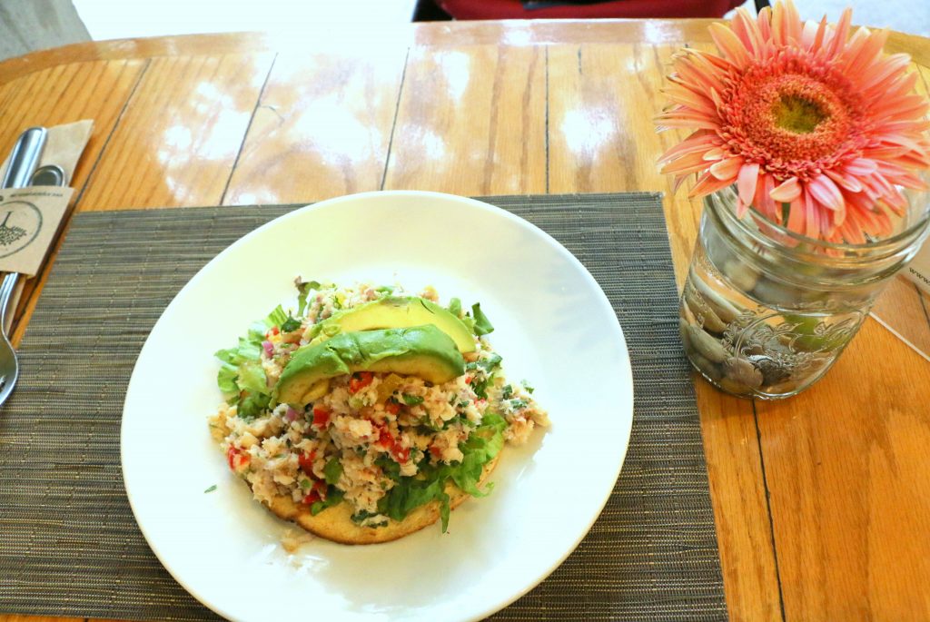 パンの上に、ほぐしたチキンのサラダ、アボカドがのっている料理です。