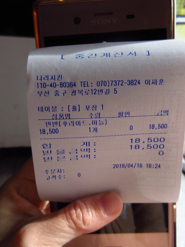 ハーフ&ハーフにした時のお会計は18,500ウォンでした。