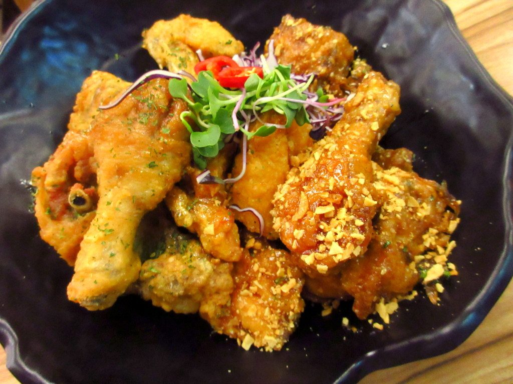 上にガーリックが乗っている方が醤油のタレを使ったチキンで、
