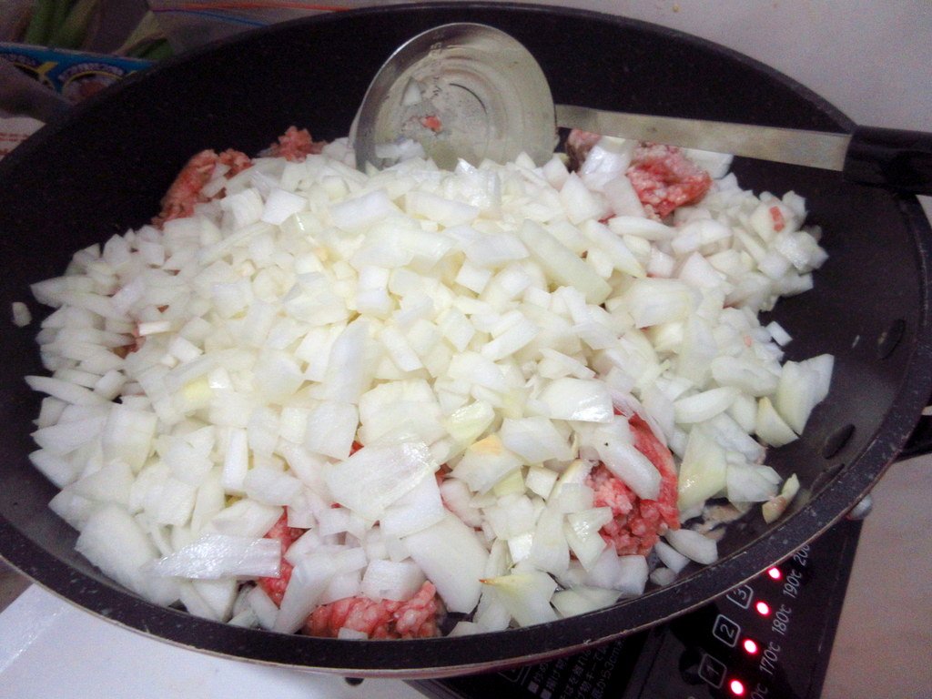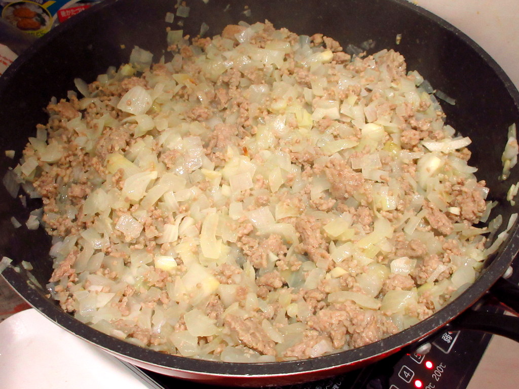 フライパンに油少々とにんにくを炒め香りが出たらひき肉と玉ねぎを入れます。