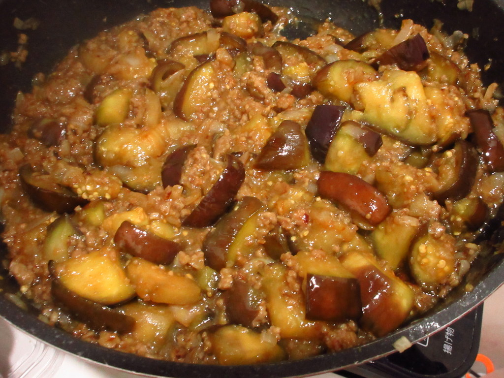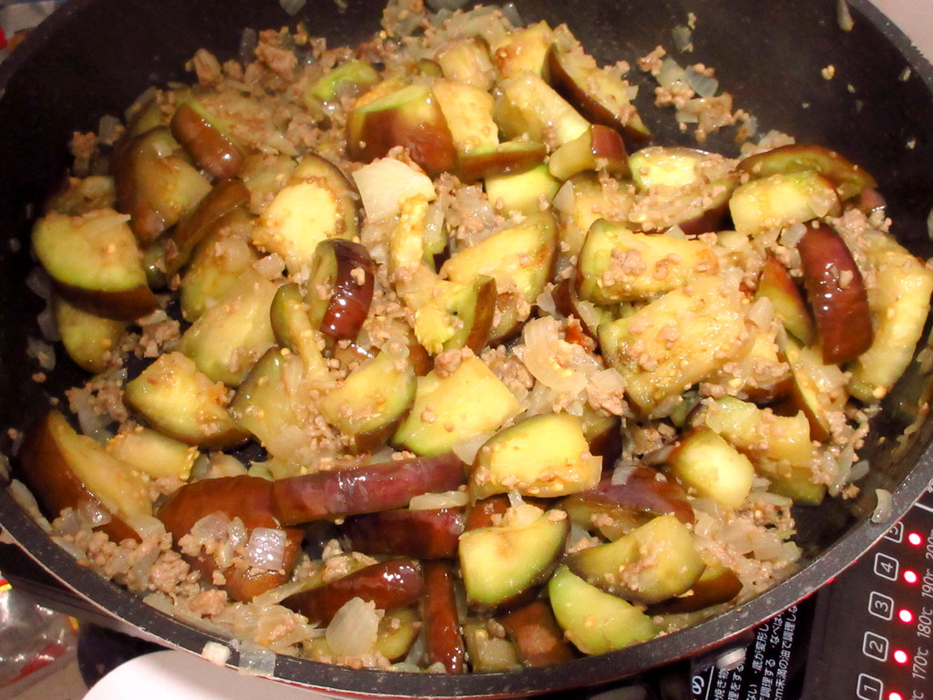 ひき肉から油が出てきたらナスを入れて炒め、ひき肉から出た油をしっかりと吸わせます。