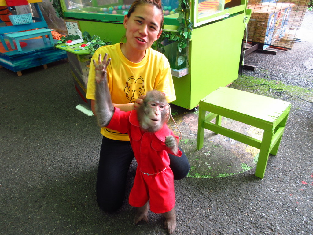 猿まわし劇場ショーは、2足歩行で服を着た人間らしいおさるさんが見られるのと