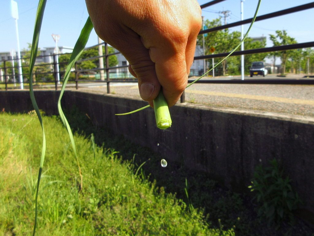 にんにくの芽をカットすると、目の前で切り口から水滴がしたたり落ちます。