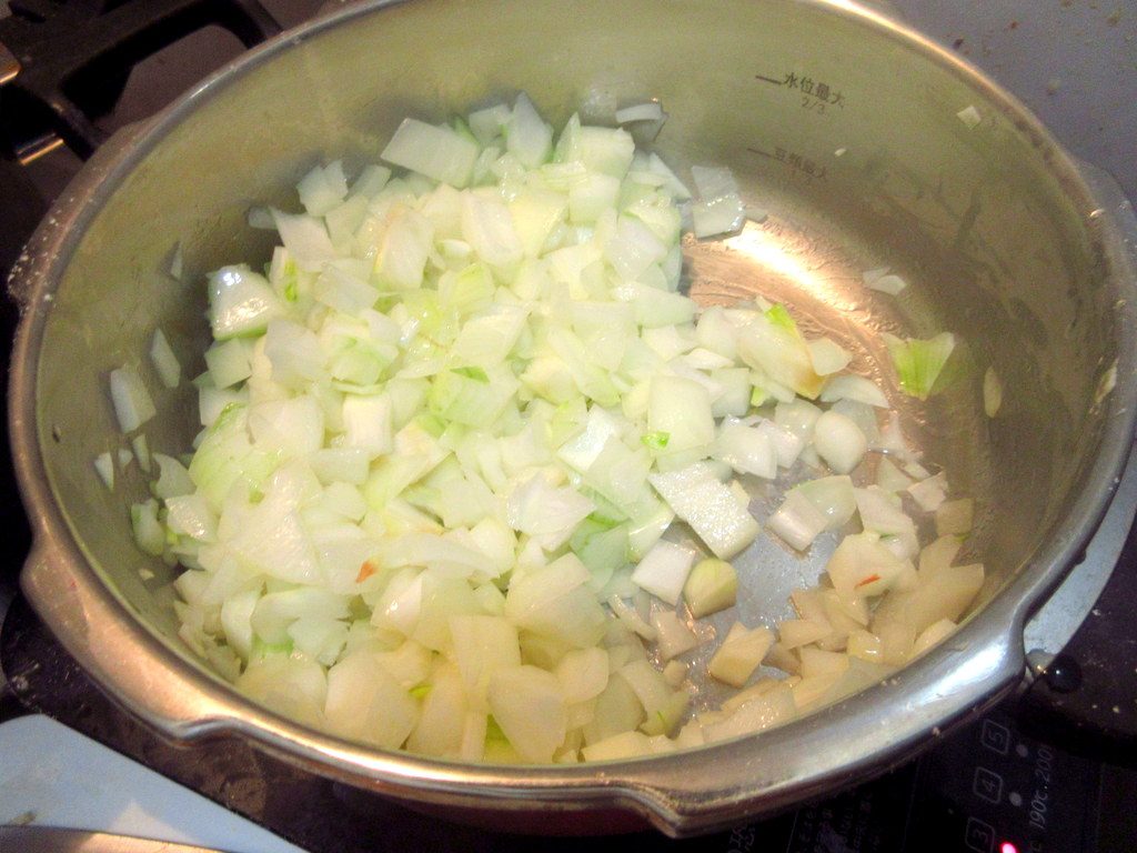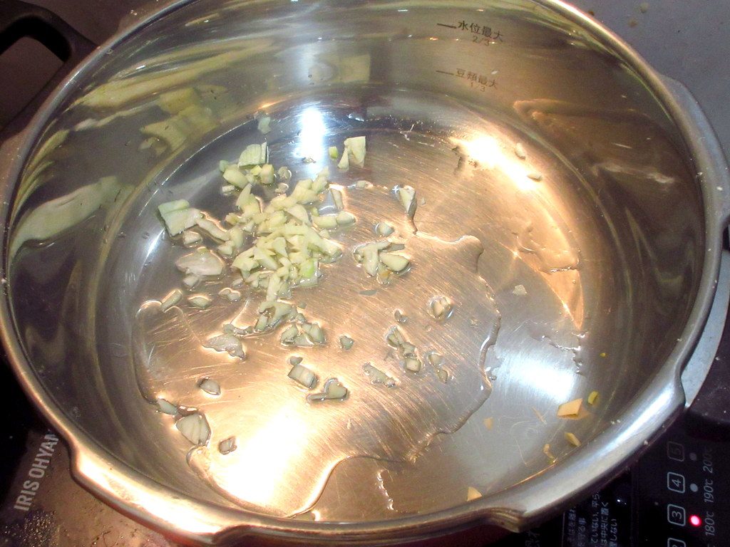 一旦それを取り出して、鍋に油をひき、みじん切りのニンニクを入れて、