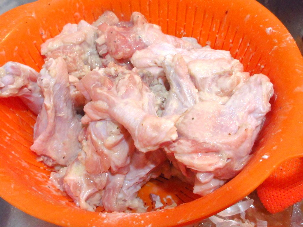 塩コショウ少々で下味をつけて、片栗粉大さじ4と小麦粉を大さじ4をまぶして