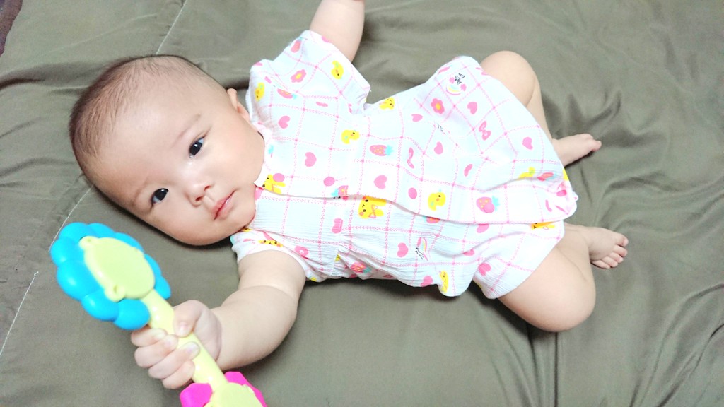物を握る力も少し強くなってきて、母がくれたおもちゃを持たせると、不思議そうな顔で遊びます(^^)/
