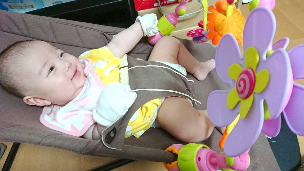 バウンサーにとりつけていると、夢中になって遊びだします。