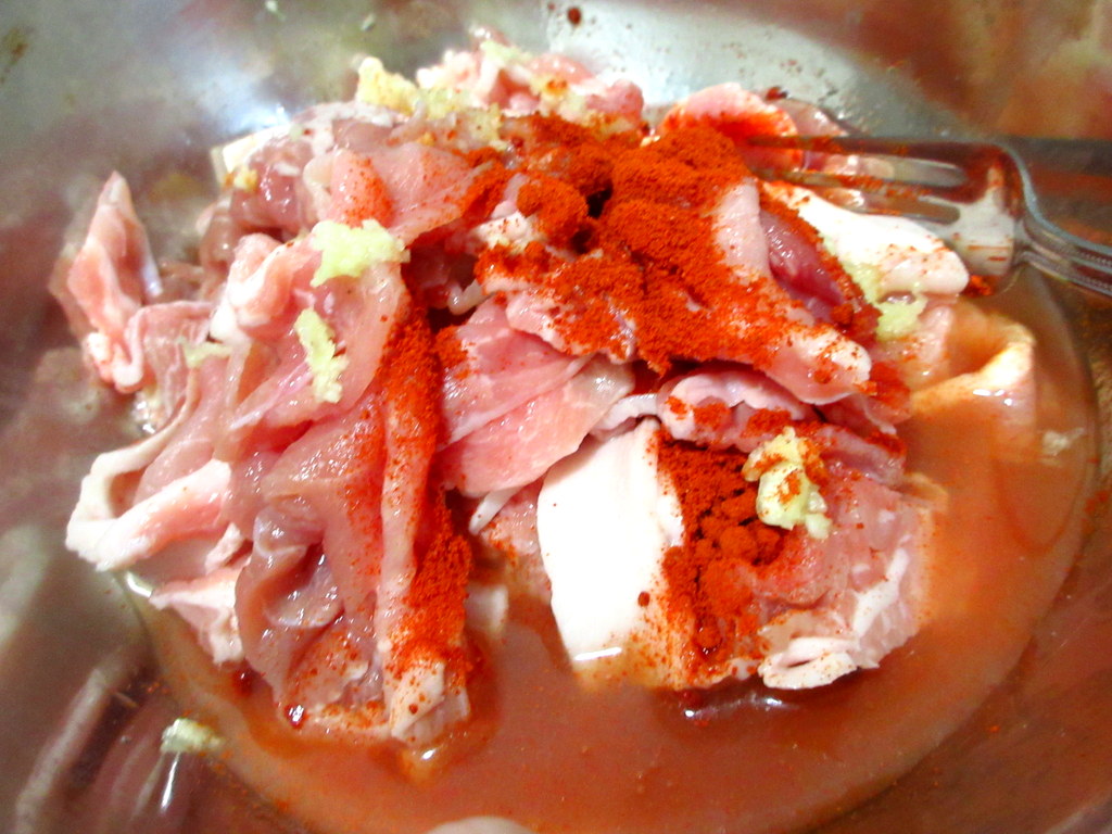 フライパンの片方に寄せ、漬け込んだ豚肉を投入し、さらに炒めていきます。