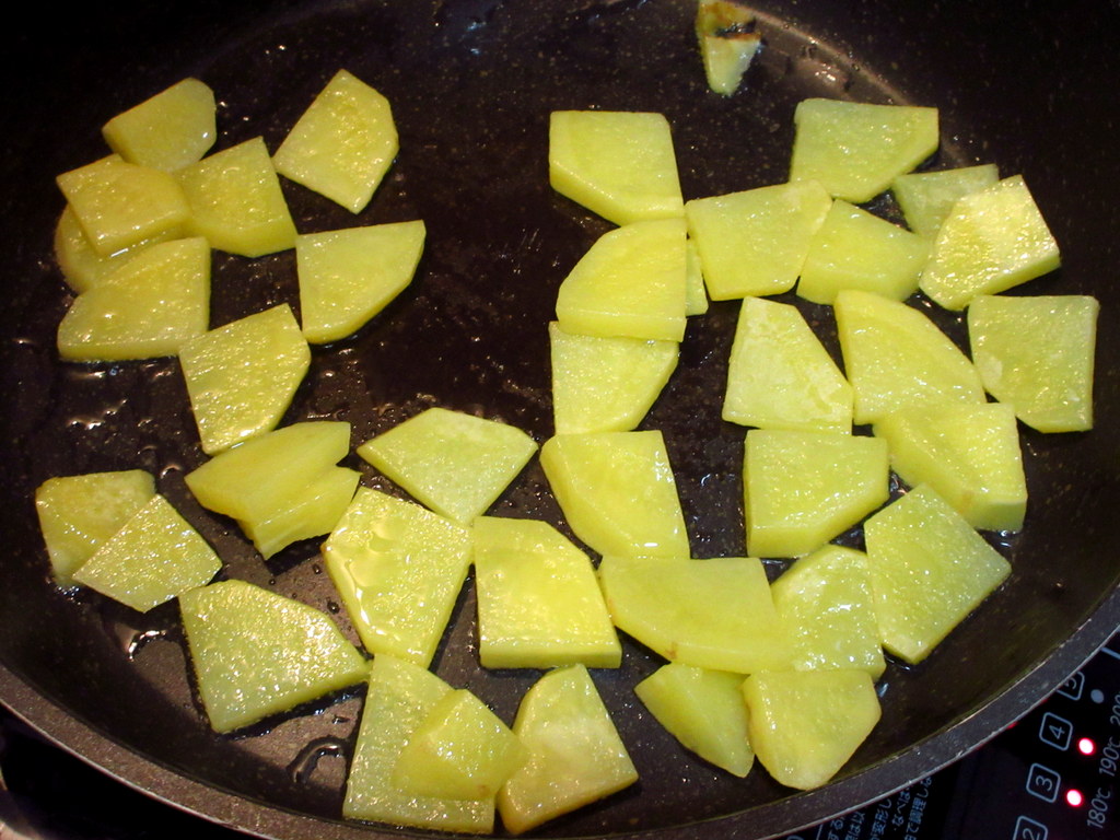 フライパンに油を熱し、じゃがいもが透き通るまで炒めます。
