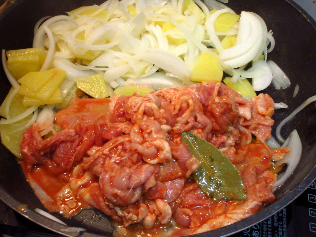 ここに、一口大に切った豚細切れ肉と、ローリエを入れて、