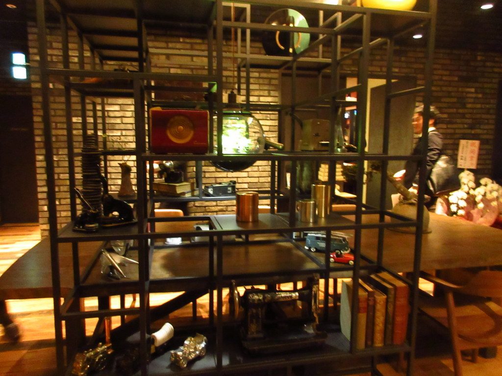棚には、骨董品のディスプレイがセンスよく並べられていました。