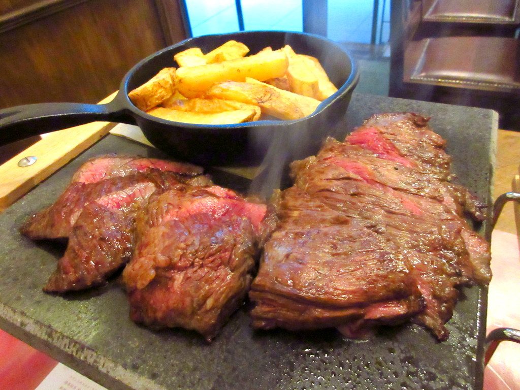 石板の上に乗って運ばれてきたステーキは、