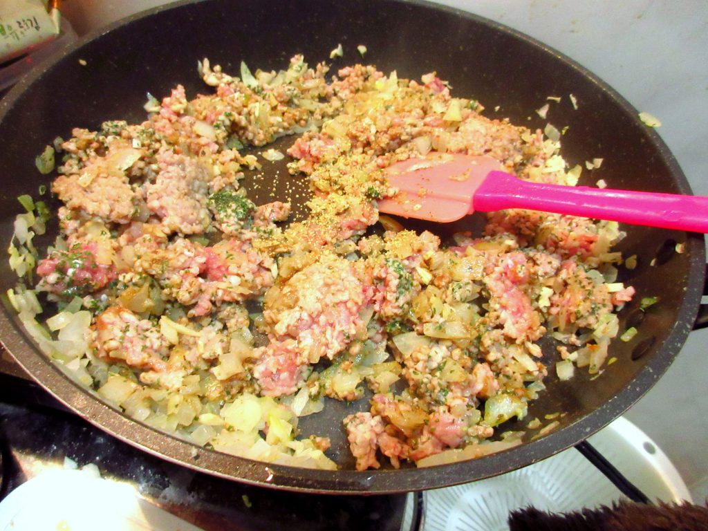 ①フライパンに油を熱し、にんにく、玉ねぎを炒め、ひき肉を入れます。
