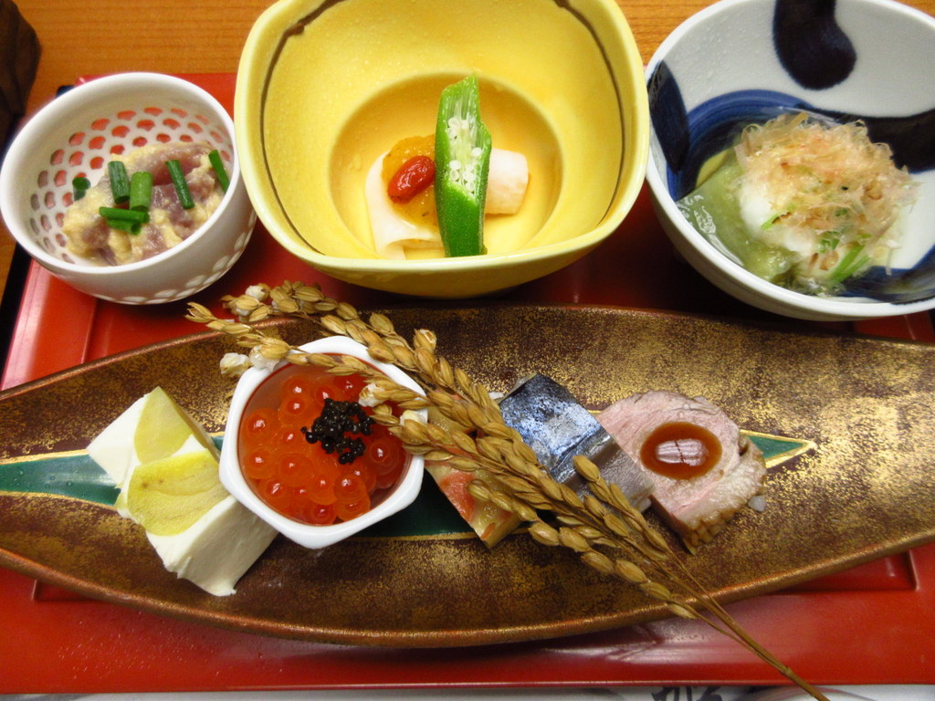 茄子のとろろ・柿の種の大根巻きのオクラクコの実・鰹の酒盗・合鴨