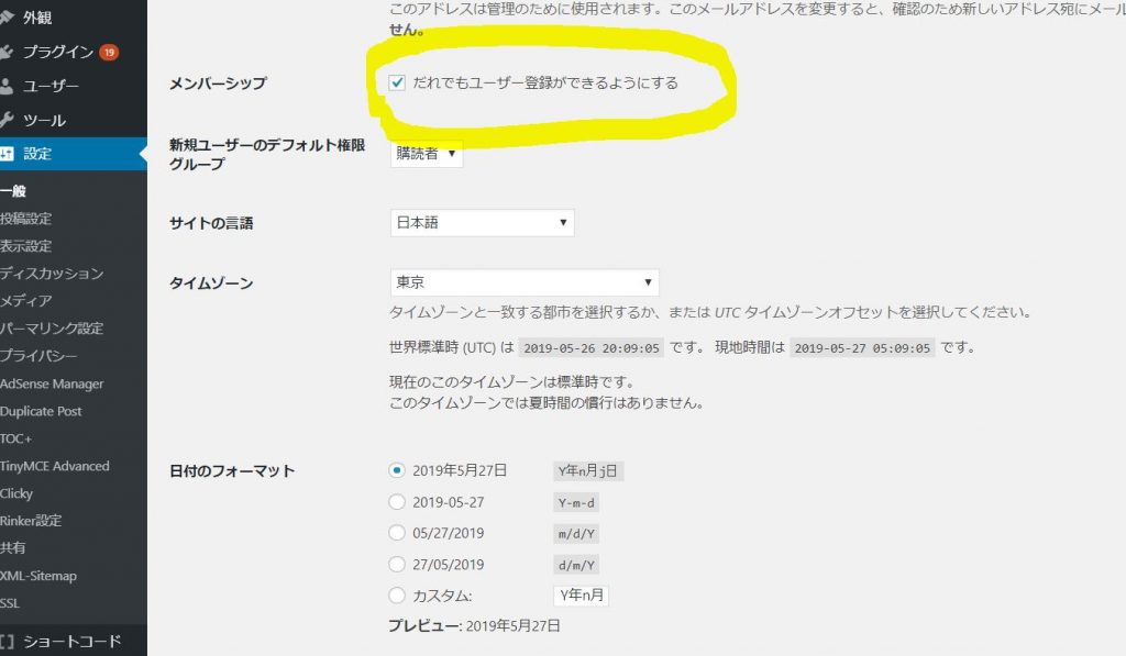 「誰でもユーザー登録ができるようにする」のチェックボタンを外し、