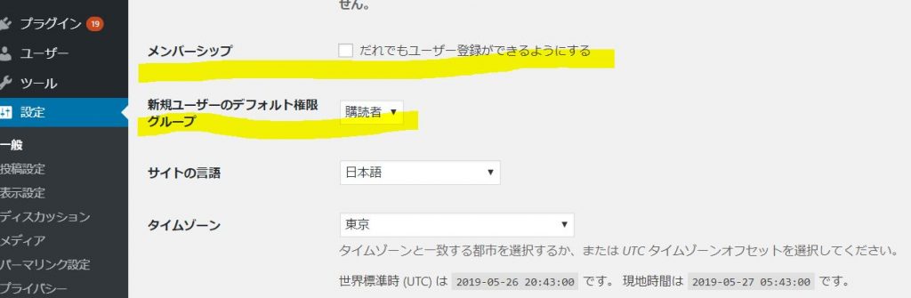 念のために「新規ユーザーのデフォルト権限グループ」が「購読者」に