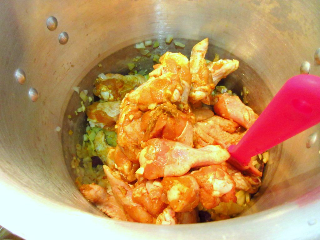 そのあとスパイス類と鶏手羽元を入れ、焦がさないように炒めます。