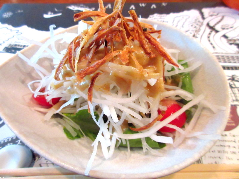 大根の千切りや揚げたポテトに、とっても美味しいドレッシングがかかっています。
