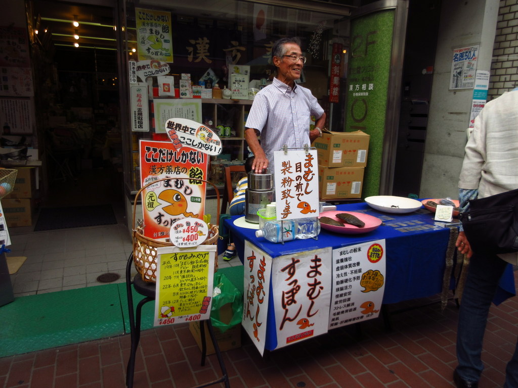 漢方薬局の前にはマムシを目の前で製粉する実演販売(!)があったり、