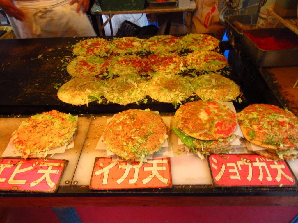 エビ天・イカ天・生姜天の中から選ぶことができる、簡単なお好み焼きのおやつです。