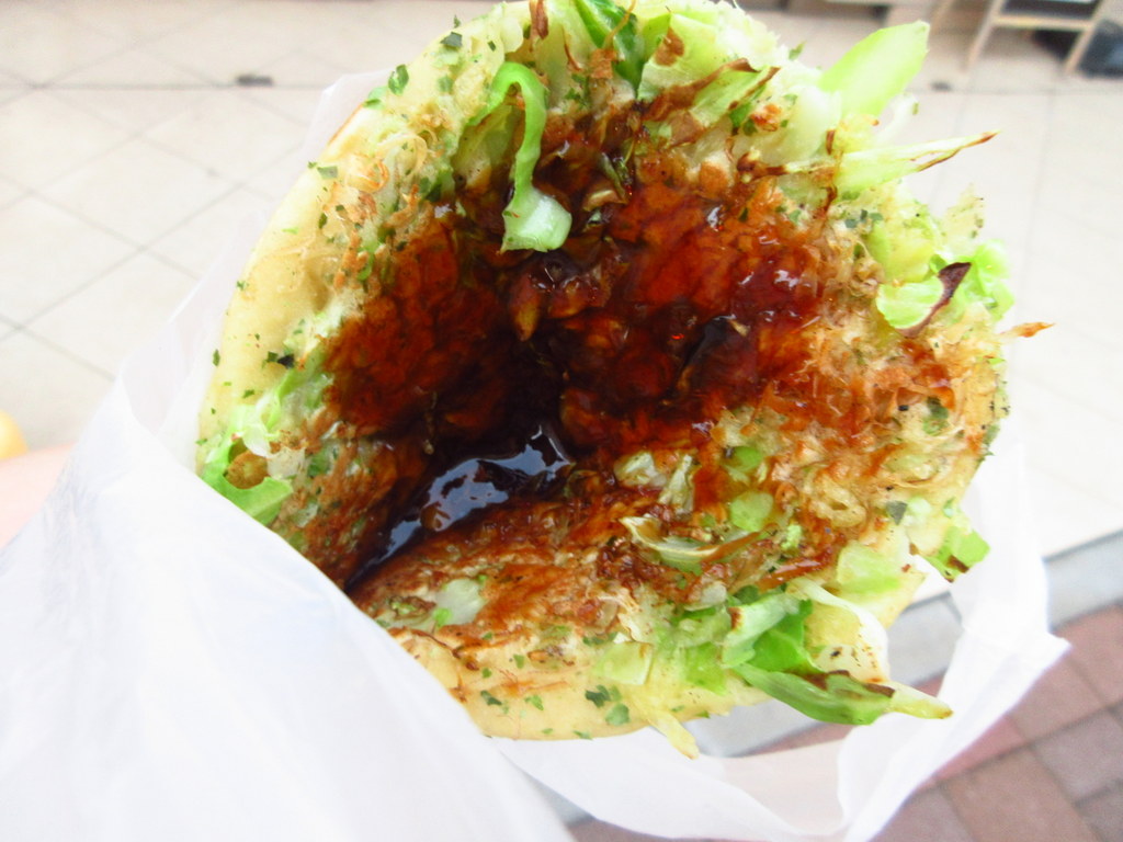 パリパリせんべいに挟まれた巣鴨名物のお好み焼きです。