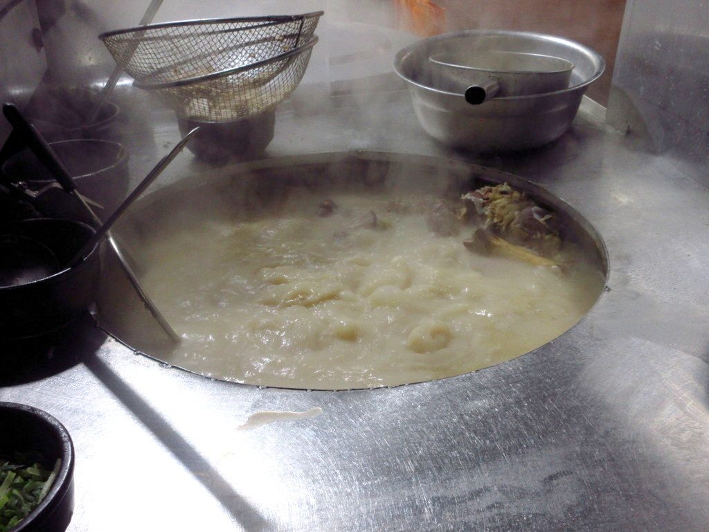 お店の前には大釜でグツグツと煮出した白濁の豚骨スープが見えます。